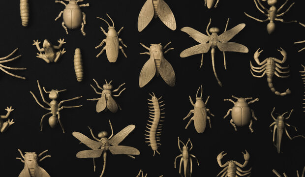 A close-up of a male scorpionfly with its curled tail, isolated on a white background