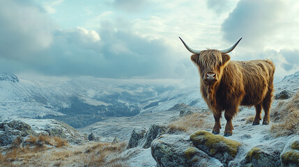 Brown scottish highland cow standing in a mountain landscape.
