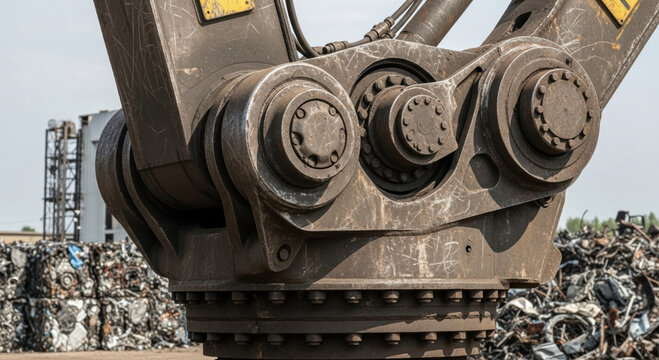 Powerful robotics equipment shows immense grit of metal recycling industry. This close up on hydraulic shear highlights automation and machinery strength at scrapyard