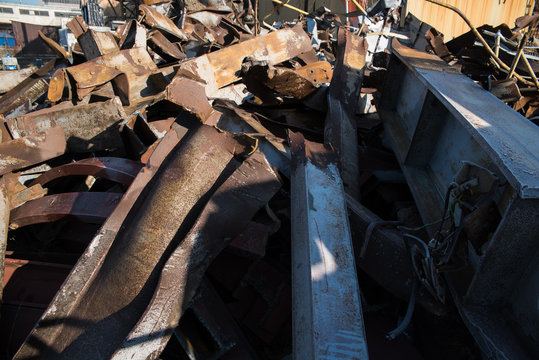 Rusty metal scrap collection in industrial yard
