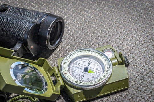 Nice green military compass and old black binoculars. On a black textured background. Army magnetic compass. Topic: strategy, calculation, orientation, search, finding