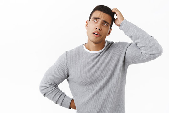 Thoughtful and hesitant good-looking young man, thinking looking focused up, scratching head pensive, remember something important, standing uncertain over white background