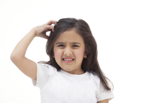 Portrait of thoughtful puzzled girl scratching her head with finger