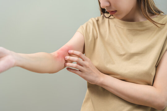 Young woman scratching herself on color background