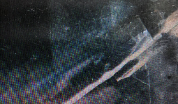 Damaged screen. Glitch glow flare. Fiction light color scratch defocused black background copy space. Distressed gradient distortion surface.