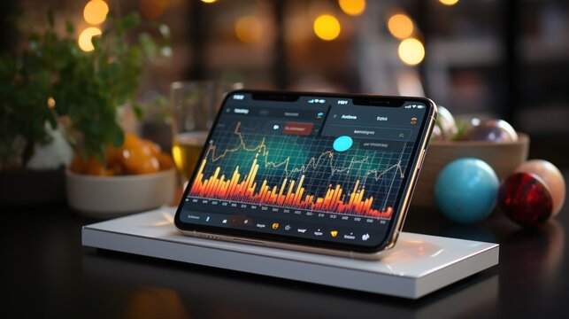 Digital dashboard with candlestick bar and line graph interface