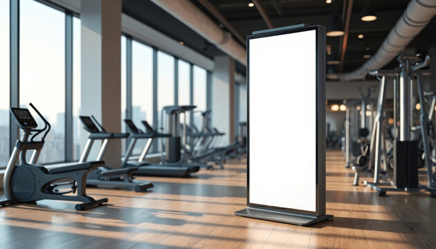 Modern gym interior with cardio machines and weight equipment. A tall digital display frame stands on the wooden floor showing a blank screen ready for graphics, promotions or ads.