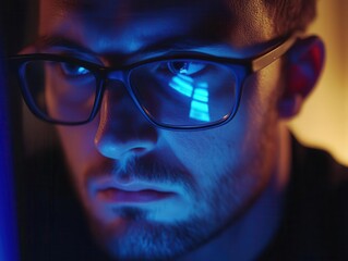 Young woman wearing glasses with reflection on dark background, closeup