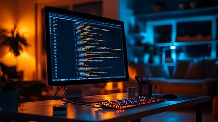 Cyberpunk night walk on wet neon street with holographic code panels and rain reflections