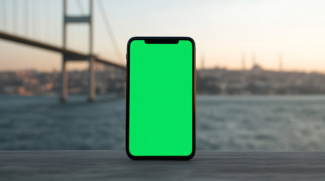 Phone with green screen on a wooden surface in front of a blurred cityscape with a bridge, ideal for app demos or location simulations. Tech and travel concept.