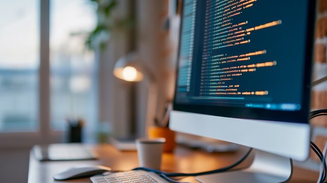 Focused programmer debugging code in modern workspace tech hub digital environment close-up view concentration on coding