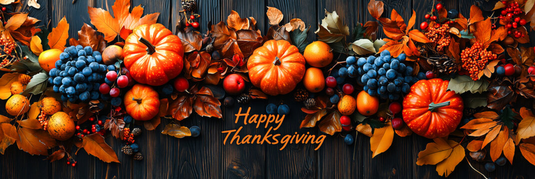 Elegant calligraphy script reading Happy Thanksgiving with festive autumn pumpkin, leaf, and fruit.
