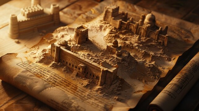 A simple stick figure character on an ancient rolled map, embarking on an exciting exploration and adventure through a textured landscape.