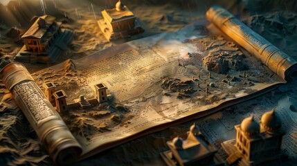 an ancient scroll with miniature models of sand-crafted buildings and figures