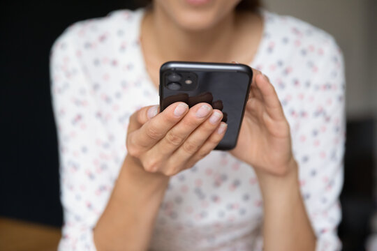 Hand closeup browsing food online store on cellphone app. Person scrolling screen choosing meal on menu