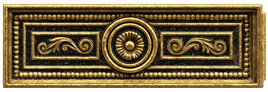 Ornate golden architectural detail with floral center and scrolling accents, set against a dark background