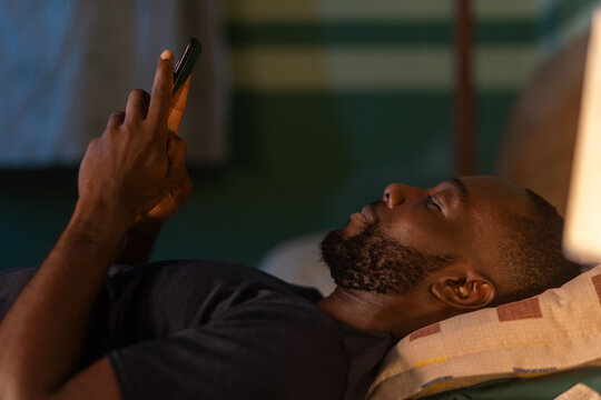 Mobile night. Gadget insomnia. Relaxed sleepy bored woman using phone app online scrolling feed in bed late in dark home bedroom.