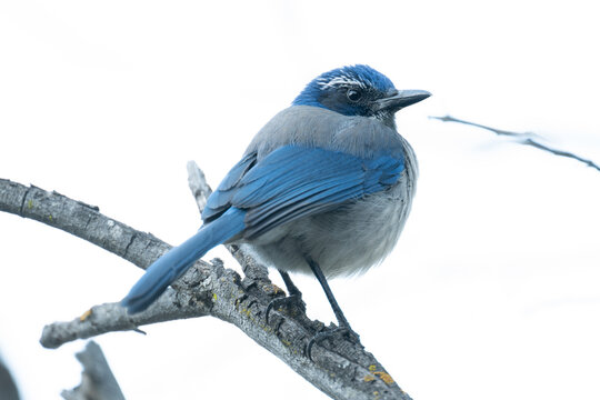 Preparing to take flight. A Western Scrub Jay preparing to take flight from the branch of a Pinon Pine Tree in northern Arizona.