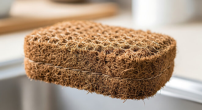 Close up of a brown coconut fiber scrub pad sitting on a stainless steel surface near a kitchen sink