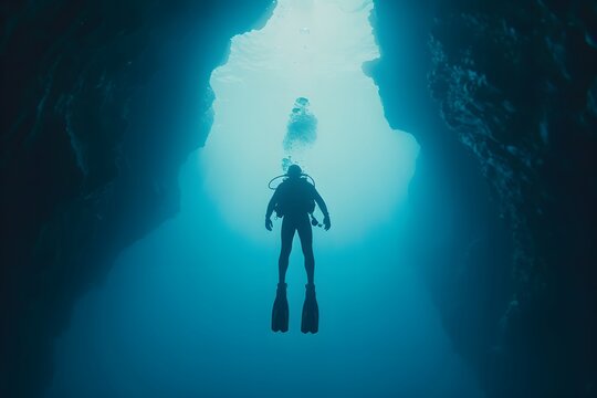 Mesmerizing view of a female scuba diver swimming underwater