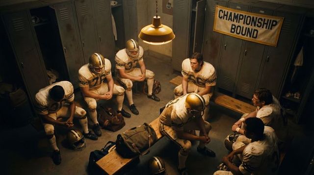 Urban football team huddling in gritty locker room before championship game