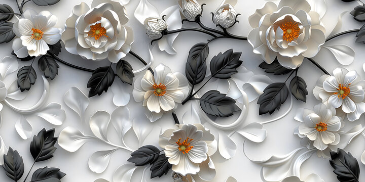 Seamless Elegant 3D Floral Wallpaper Design in White, Gold Flower, and Black Leaves with Sculpted Aesthetic on a White Background. Seamless Tile Flower Wall Sticker