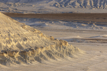 View of sunlit, pale cliffs sculptured by wind and time stand against a vast, flat desert landscape, their textures contrasting sharply, Bozhira, Mangystau Region, Kazakhstan.