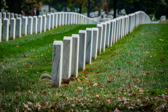 View of rows of white headstones stand in solemn formation across a vibrant green lawn, as a squirrel scurries amidst fallen leaves, Arlington, Virginia, United States.