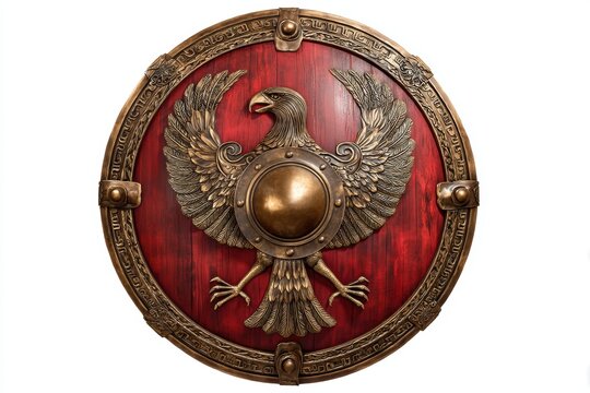 Roman scutum with ornate eagle emblem showcasing ancient craftsmanship and design on white background