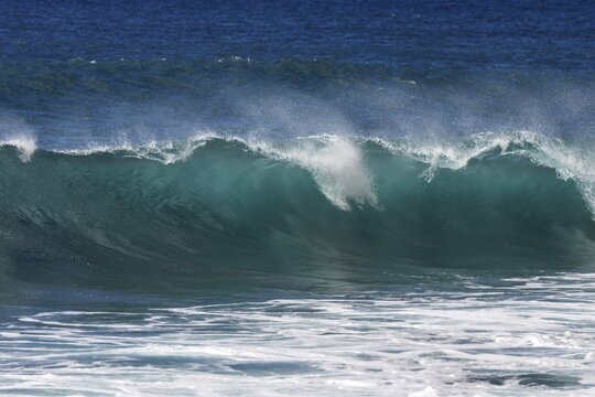 Turquoise ocean wave curling into perfect barrel with white foam, spray and sunlit mist