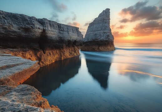 coastal cliffs and a towering sea stack reflected in a calm tidal pool at golden sunset, tranquil and awe inspiring seascape