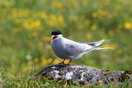 Close up of an Arctic tern in flight against snow capped mountains in Isafjordur, Iceland on 7 June 2025