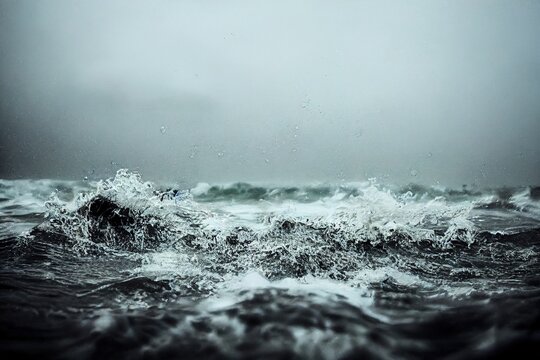 Dramatic ocean wave crashing on rocky shore at stormy coastline