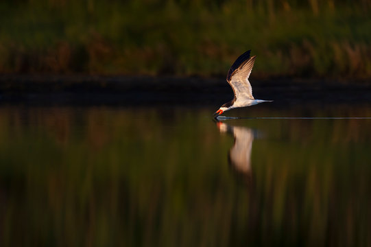 A Black Skimmer flies low over the water dragging its bill in the water trying to catch food on a calm morning with its reflection.