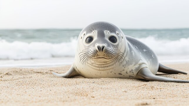 Adorable Seal Pup on Sandy Beach with Gentle Ocean Waves in Background