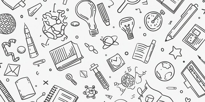 School supplies seamless pattern. Education accessories pencil and pen notebook black line doodle cartoon isolated on white background creative design textile.