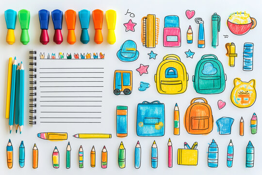 A white background with colorful markers and doodles of school icons like backpacks