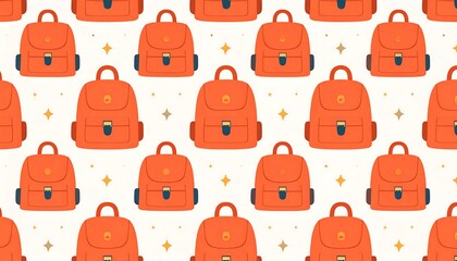 Seamless pattern of orange backpacks on white background, accented with small gold stars