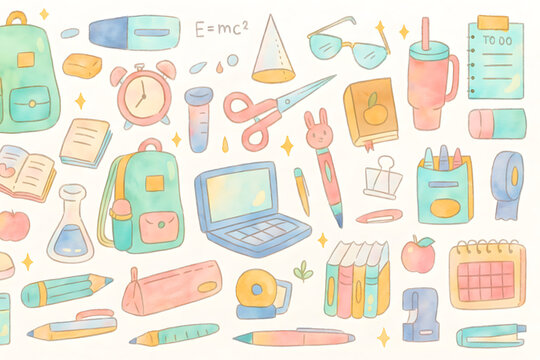 Seamless Whimsical Hand-Drawn Watercolor Doodle Illustration of School and Stationery Items with Pastel Colors on White Background