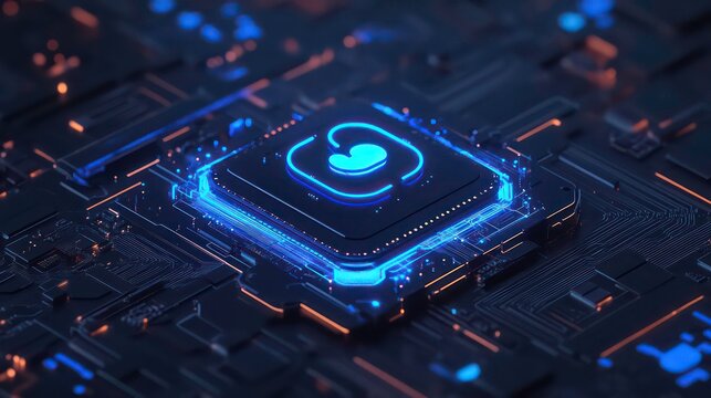 Futuristic circuit board pattern with glowing neon lines in blue, purple, and orange, symbolizing digital technology, data flow, and electronic innovation.