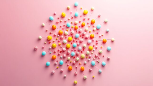 A cheerful wallpaper with small colorful Easter eggs arranged in a circular pattern on a light pink background