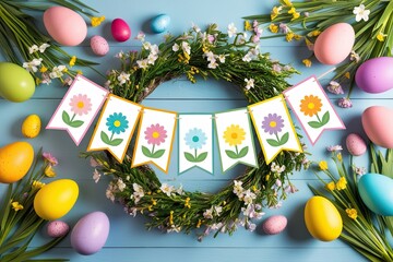 easter eggs background, blue background with spring flowers, Easter holiday background with copy space