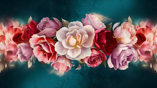 Floral branch seamless pattern on watercolor texture with gold, dark, navy, purple, emerald, green and turquoise hues, suitable for editorial header background