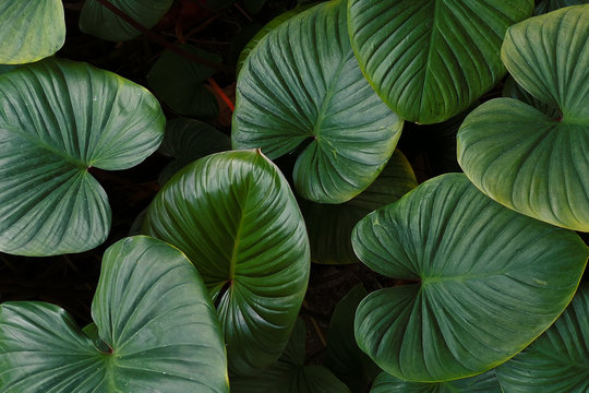 Tropical Green Leaf Pattern In the garden, a background of dark green tropical leaves. closeup nature view of green leaf. The highlight a focused leaf edge and blurred background