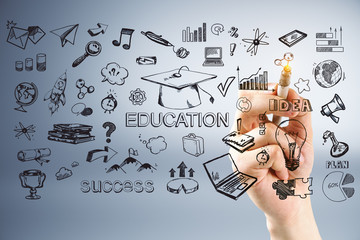 Seamless pattern featuring school supplies like books, backpacks, apples, pencils, rulers, clocks, and school buses on a light blue background.