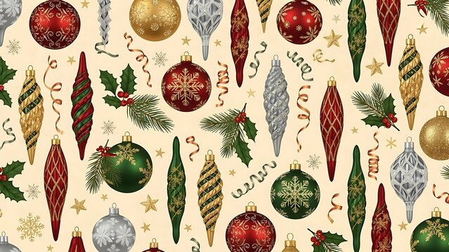 Seamless pattern of diverse watercolor Christmas baubles for holiday decoration.