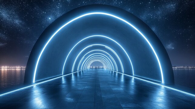 Futuristic Tunnel with Neon Lights and City Skyline at Night