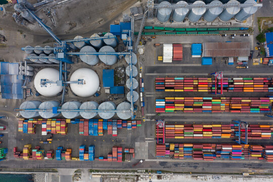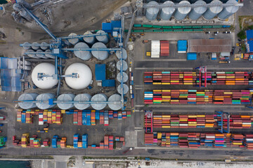 System transport and logistics concept.Aerial top down ultra wide photo of industrial cargo container ship loading in logistics terminal port.Stack of Containers Cargo Ship Import/Export