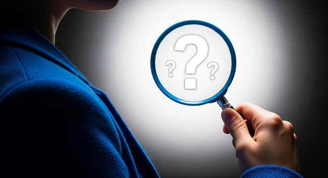 Magnifying glass illuminating a large glowing question mark. Represents inquiry, searching for answers, problem-solving, and curiosity.