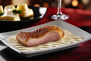 Exquisite culinary dish featuring perfectly seared pork chop, complemented by creamy mashed potatoes and vibrant cranberries, rosemary and onion garnish, a rich and savory delight.